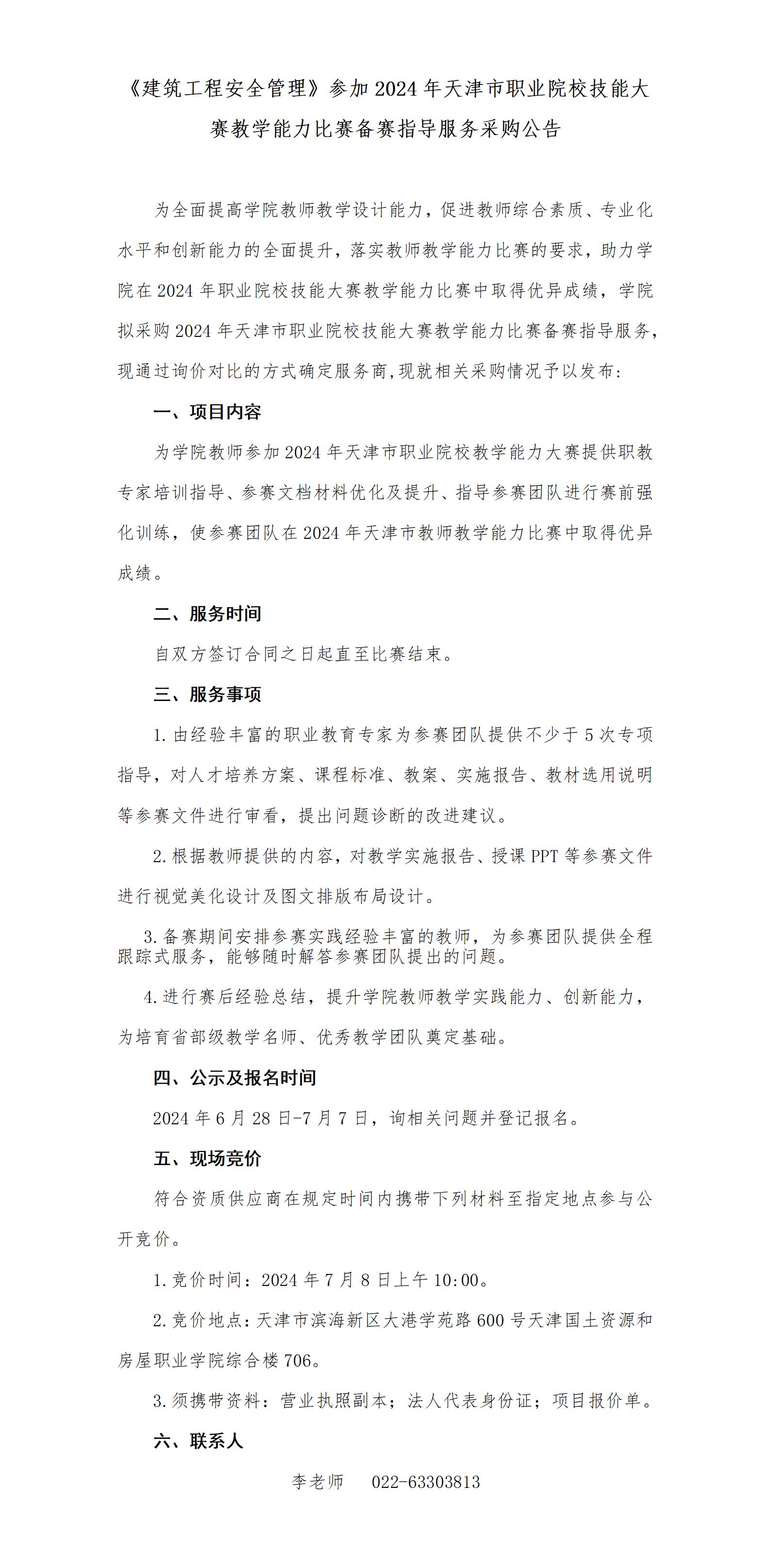 《建筑工程安全管理》参加2024年天津市职业院校技能大赛教学能力比赛备赛指导服务采购公告