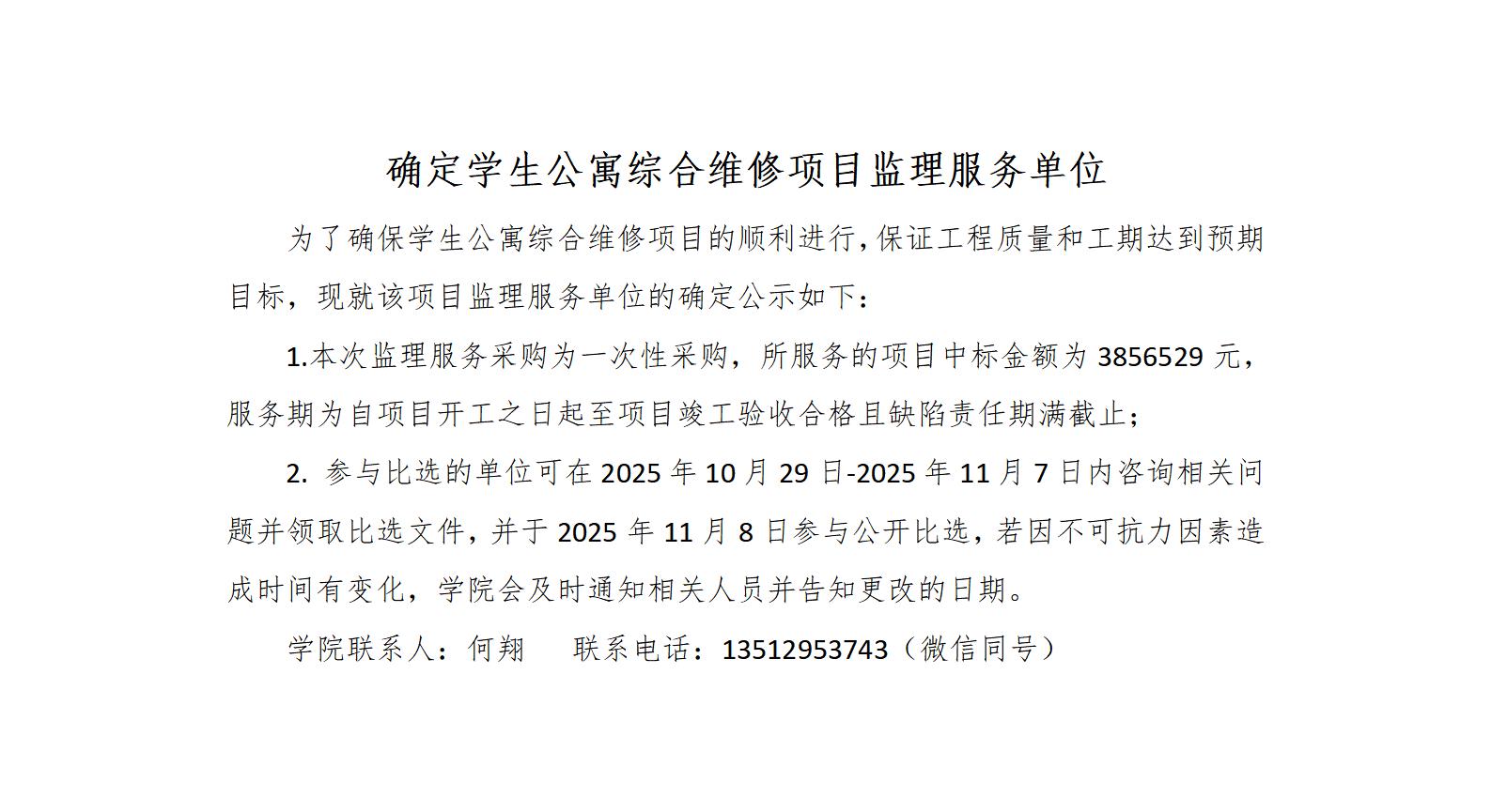 确定学生公寓综合维修项目监理服务单位