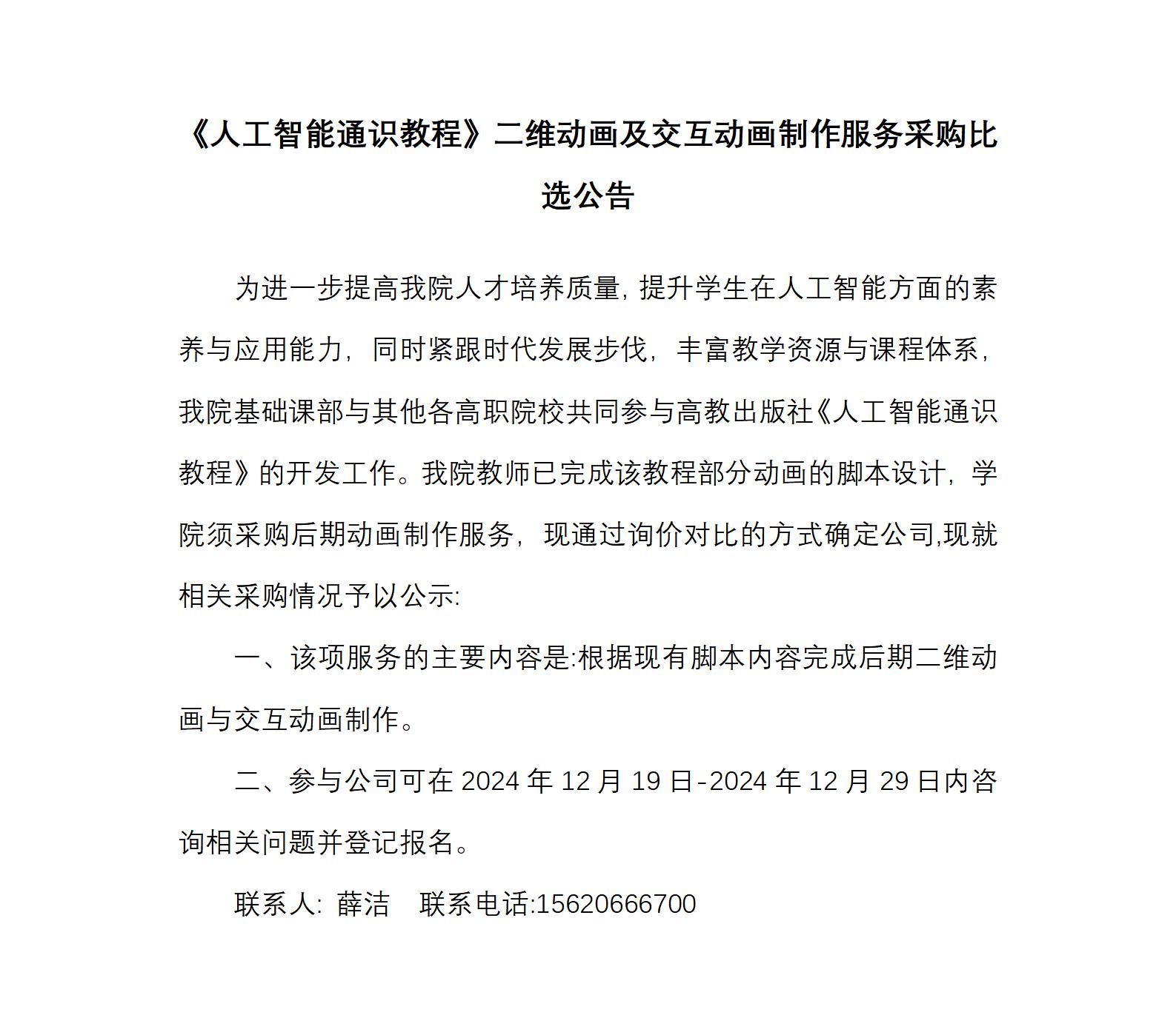 《人工智能通识教程》二维动画及交互动画制作服务采购比选公告