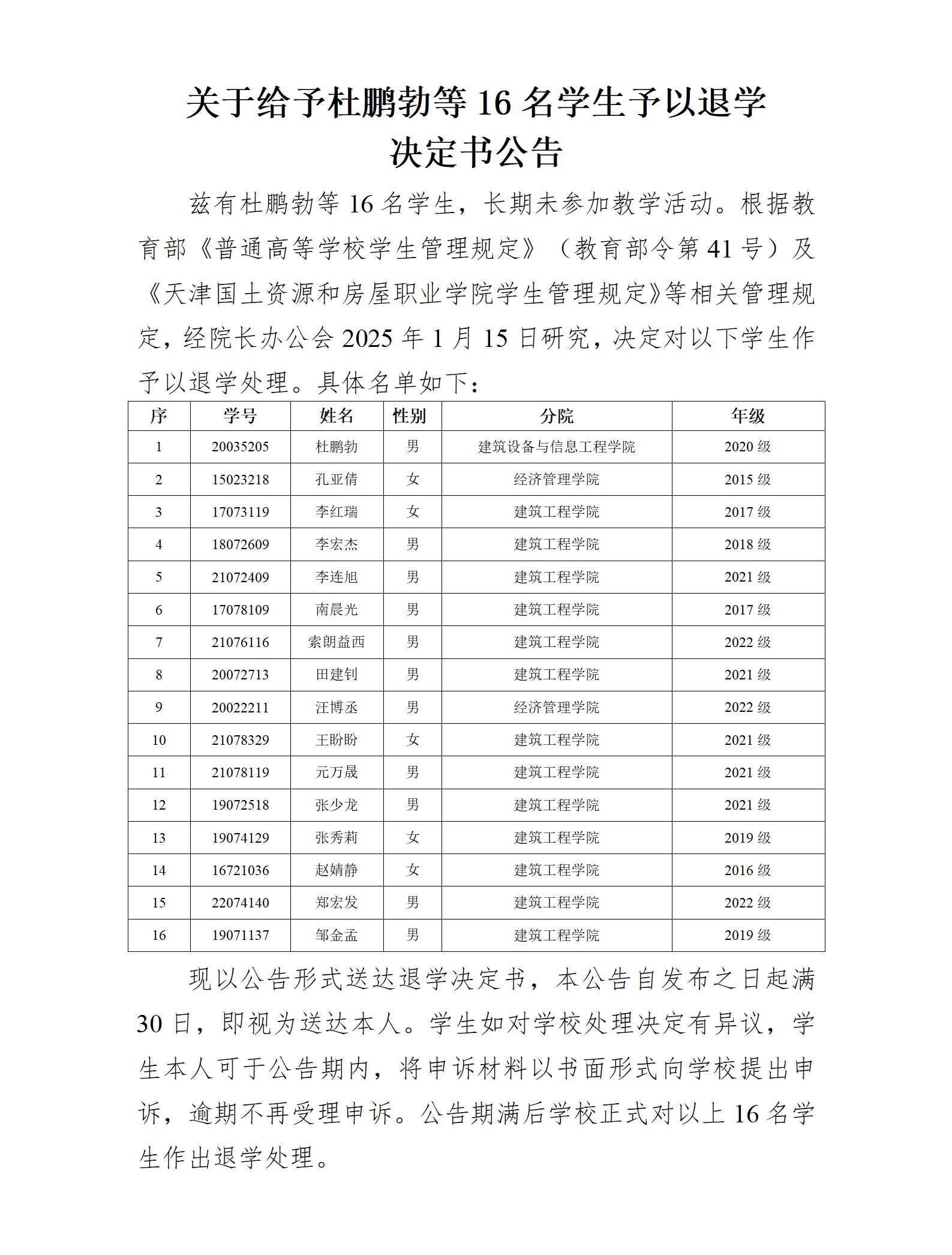 关于给予杜鹏勃等16名学生予以退学决定书公告