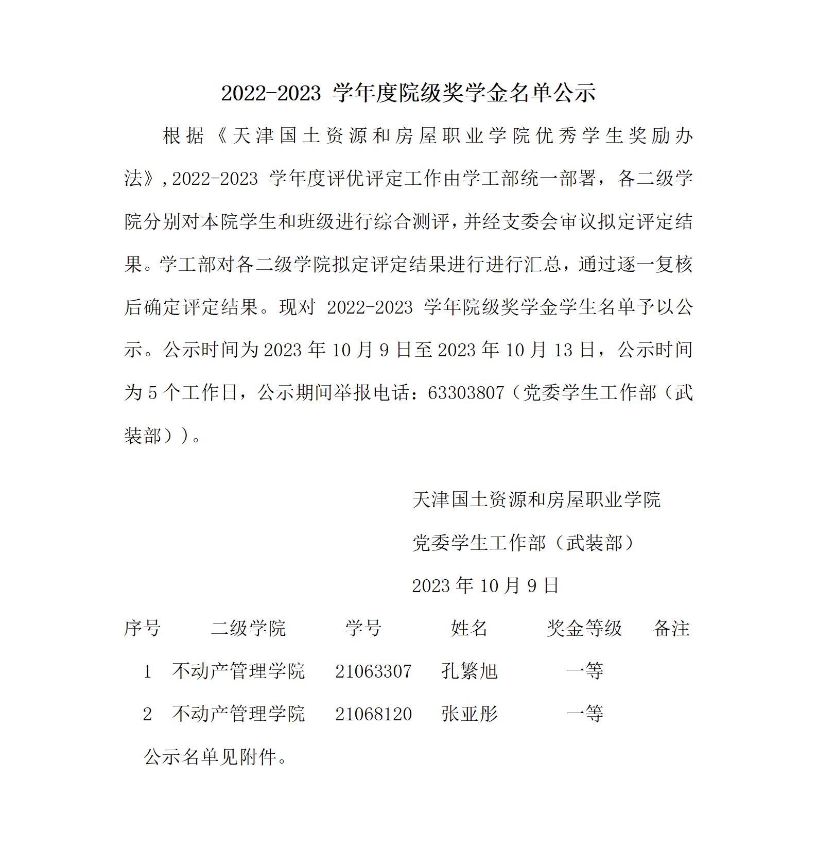 2022-2023学年度院级奖学金、优秀学生干部、优秀集体名单公示