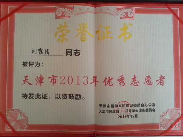 简报2013年第159期 学院团委副书记刘露倩被评为“2013年天津市优秀志愿者”