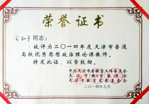 简报2014年第88期 学院金秋平老师被评为天津市普通高校优秀思想政治理论课教师