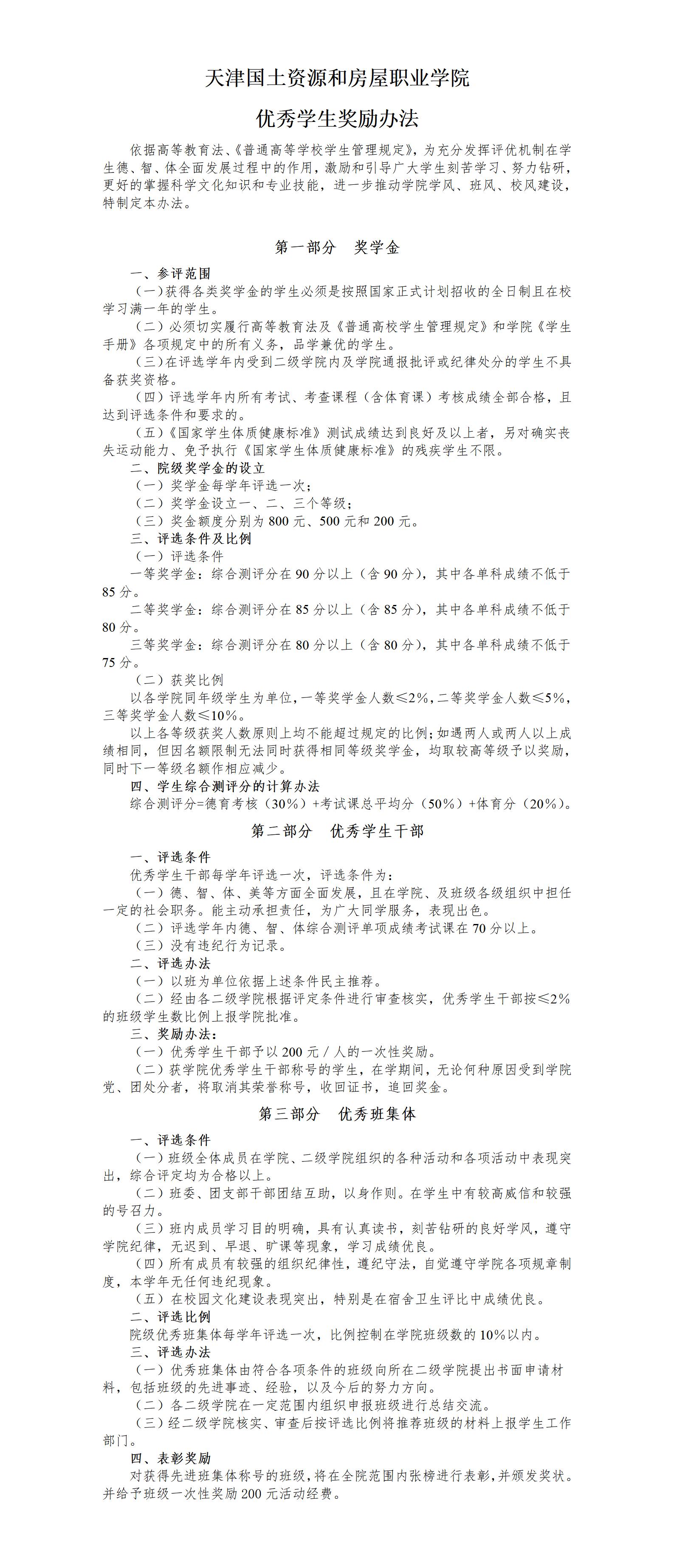 天津国土资源和房屋职业学院优秀学生奖励办法