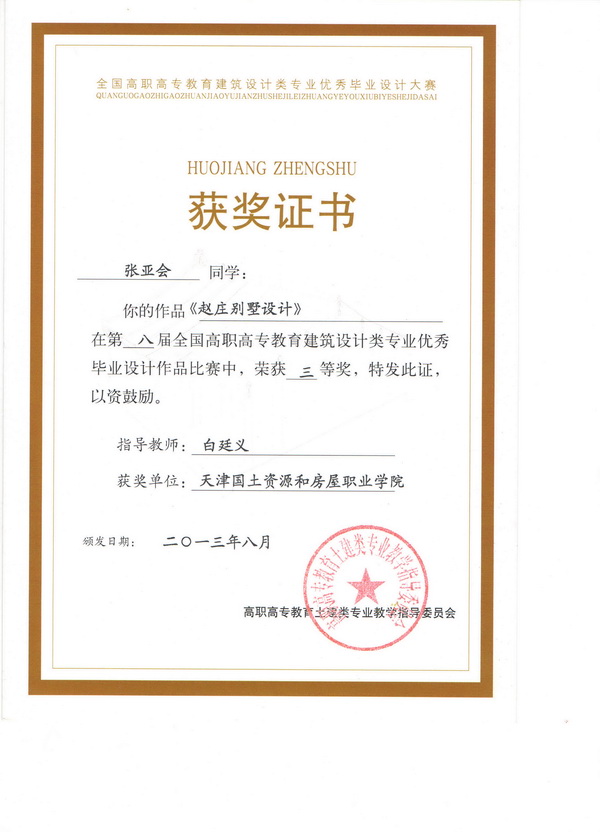 共有建筑装饰、室内设计、建筑设计(古建)、环境艺术设计四个专业类别的229件作品参加了优秀毕业设计作品奖的评比,其中,我系白廷义老师指导的2013届毕业生张亚会的作品“赵庄别墅设计”获得环境艺术设计组三等奖。(撰稿人:艺术系郝宇)