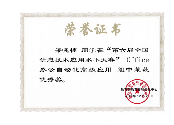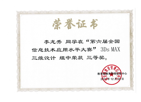 日前,我院建筑设备工程系学生参加了由教育部教育管理信息中心组织的第六届全国信息技术应用水平大赛。由王妍、王同梅、马莉3位老师指导的2009、2010级计算机应用技术专业5位学生在3Ds MAX三维设计、office办公自动化高级应用竞赛模块中取得优异成绩。(建筑设备工程系)