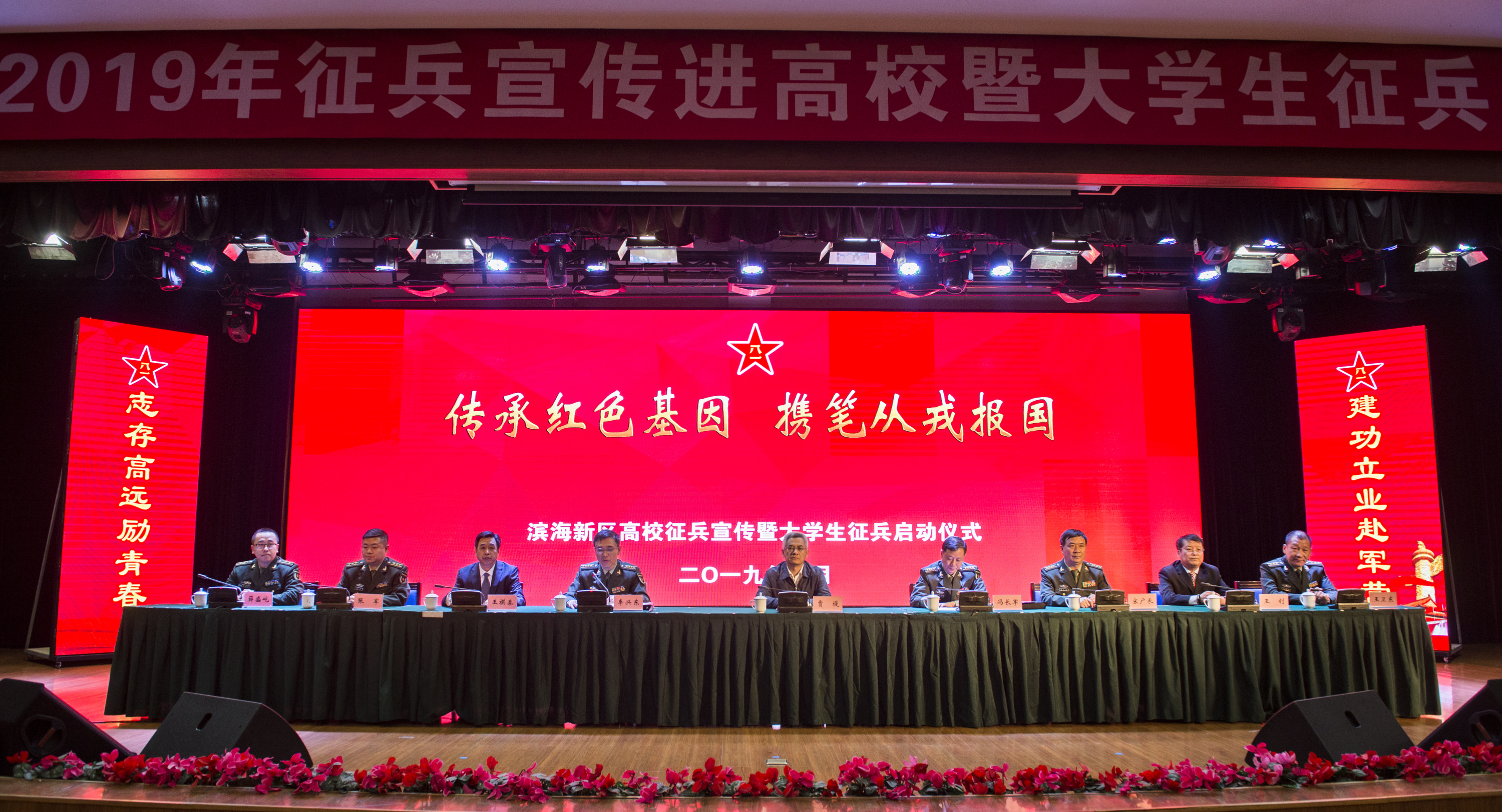 4月28日,2019年高校征兵宣传暨大学生征兵启动仪式在我院成功举办。滨海新区区委常委、常务副区长、滨海新区征兵工作领导小组副组长贾堤出席,滨海新区军事部部长、新区征兵工作领导小组副组长冯长军出席仪式并讲话,军事部政委、新区征兵工作领导小组副组长车兴东主持仪式,滨海新区军事部副部长、新区征兵办公室主任宋广长,学院党委书记王祺泰,党委副书记、院长王钊,党委副书记郭凤荣出席仪式,各高校、街镇等相关部门负责同志及学生代表近八百余人参加仪式。