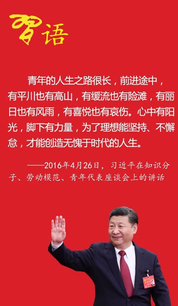 考上大学固然可喜,但没考上大学也不用悲观,更不能绝望。路就在脚下。 ——《之江新语》之《路就在脚下》一文(2003年7月11日) 一个人能否成才,关键不在于是否上大学,而在于他的实际本领。社会本身就是一个大学校,留心处处皆学问。只要你肯学习、能吃苦,没有读过大学,照样能成才。 ——《之江新语》之《路就在脚下》一文(2003年7月11日) 一定要从社会、学校和家长等多方入手,千方百计把孩子从分数中解放出来。要让他们明白,人生道路千万条,各行各业都能成才。只要矢志追求,努力拼搏,照样可以实现人生抱负和目标。 ——《之江新语》之《路就在脚下》一文(2003年7月11日) 树理想 只有把人生理想融入国家和民族的事业中,才能最终成就一番事业。 ——2013年5月2日,习近平给北京大学考古文博学院2009级本科团支部全体同学回信 理想指引人生方向,信念决定事业成败。没有理想信念,就会导致精神上“缺钙”。 ——2013年5月4日,习近平同各界优秀青年代表座谈时的讲话 有信念、有梦想、有奋斗、有奉献的人生,才是有意义的人生。当代青年建功立业的舞台空前广阔、梦想成真的前景空前光明,希望大家努力在实现中国梦的伟大实践中创造自己的精彩人生。 ——2014年5月4日,习近平在北京大学师生座谈会上的讲话 能吃苦 蓝图不可能一蹴而就,梦想不可能一夜成真。人间万事出艰辛。越是美好的未来,越需要我们付出艰辛努力。 ——2013年4月28日,习近平在同全国劳动模范代表座谈时的讲话 无数人生成功的事实表明,青年时代,选择吃苦也就选择了收获,选择奉献也就选择了高尚。青年时期多经历一点摔打、挫折、考验,有利于走好一生的路。 ——2013年5月4日,习近平同各界优秀青年代表座谈时的讲话 成功的背后,永远是艰辛努力。青年要把艰苦环境作为磨炼自己的机遇,把小事当作大事干,一步一个脚印往前走。滴水可以穿石。只要坚韧不拔、百折不挠,成功就一定在前方等你。 ——2014年5月4日,习近平在北京大学师生座谈会上的讲话 勤学习 学习是立身做人的永恒主题,也是报国为民的重要基础。梦想从学习开始,事业从实践起步。当今世界,知识信息快速更新,学习稍有懈怠,就会落伍。有人说,每个人的世界都是一个圆,学习是半径,半径越大,拥有的世界就越广阔。 ——2013年10月21日,习近平在欧美同学会成立100周年庆祝大会上的讲话 勤学,下得苦功夫,求得真学问。知识是树立核心价值观的重要基础。人生只有一次,应该好好珍惜。为学之要贵在勤奋、贵在钻研、贵在有恒。 ——2014年5月4日,习近平在北京大学师生座谈会上的讲话 广大青年要保持初生牛犊不怕虎的劲头,不懂就学,不会就练,没有条件就努力创造条件。 ——2016年4月26日,习近平在知识分子、劳动模范、青年代表座谈会上的讲话 走好路 当代中国青年要在感悟时代、紧跟时代中珍惜韶华,自觉按照党和人民的要求锤炼自己、提高自己,做到志存高远、德才并重、情理兼修、勇于开拓,在火热的青春中放飞人生梦想,在拼搏的青春中成就事业华章。 ——2015年7月24日,习近平致全国青联十二届全委会和全国学联二十六大的贺信 青年的人生之路很长,前进途中,有平川也有高山,有缓流也有险滩,有丽日也有风雨,有喜悦也有哀伤。 心中有阳光,脚下有力量,为了理想能坚持、不懈怠,才能创造无愧于时代的人生。 ——2016年4月26日,习近平在知识分子、劳动模范、青年代表座谈会上的讲话 广大青年应该在奋斗中释放青春激情、追逐青春理想,以青春之我、奋斗之我,为民族复兴铺路架桥,为祖国建设添砖加瓦。 ——2018年5月2日,习近平在北京大学师生座谈会上的讲话 当代青年是同新时代共同前进的一代。我们面临的新时代,既是近代以来中华民族发展的最好时代,也是实现中华民族伟大复兴的最关键时代。广大青年既拥有广阔发展空间,也承载着伟大时代使命。 ——2018年5月2日,习近平在北京大学师生座谈会上的讲话