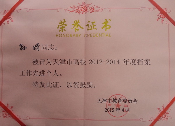 会议由天津市高校档案工作委员会理事、天津师范大学档案馆馆长张维和主持。会上,韩海涛秘书长对天津市高校档案工作委员会2014年工作进行总结并部署了2015年高校档案工作任务。张维和理事宣读了表彰2012-2014年度天津市高校档案工作先进集体、先进个人的决定,我院孙婧同志被评选为先进个人。最后,连忠锋会长指出近年来高校档案工作取得了显著成绩,为我市高等教育发展做出积极贡献。希望大家继续增强责任感,围绕中心任务,努力服务天津市高等教育事业科学发展。 (撰稿人:办公室)编辑:孙婧 审核:高义镇