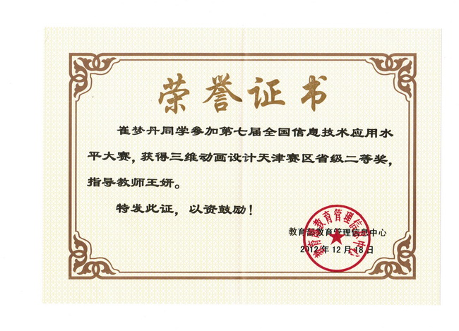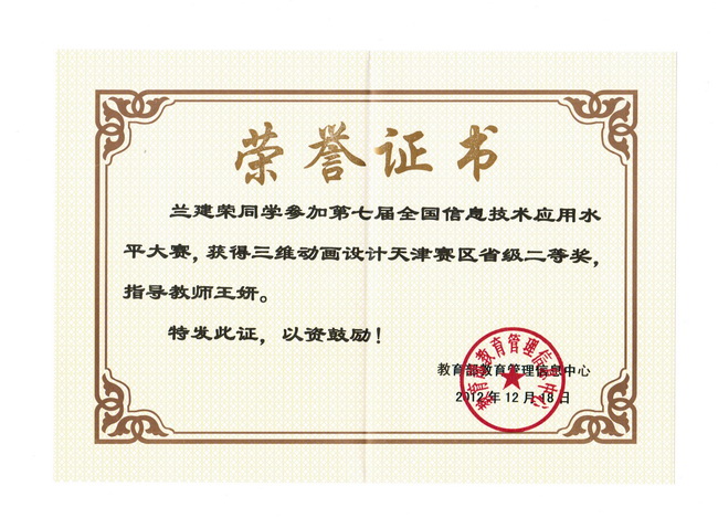 日前,我院建筑设备工程系学生参加教育部教育管理信息中心组织的第七届全国信息技术应用水平大赛。在王妍老师的指导下,2011级三二分段计算机应用技术专业崔梦丹、兰建荣两位学生分别在三维动画设计竞赛模块中荣获省级二等奖。(撰稿人:建筑设备工程系王妍)
