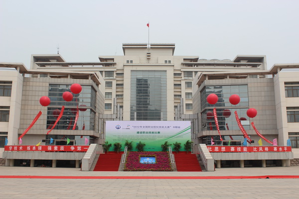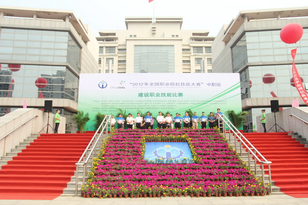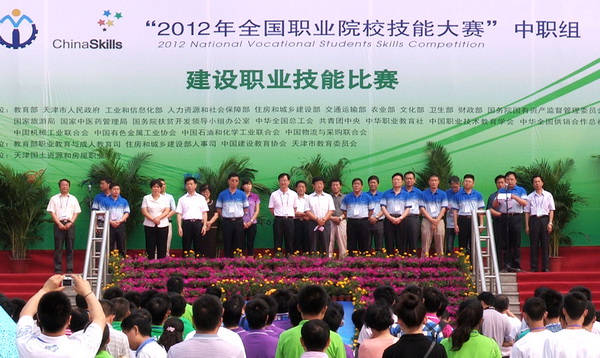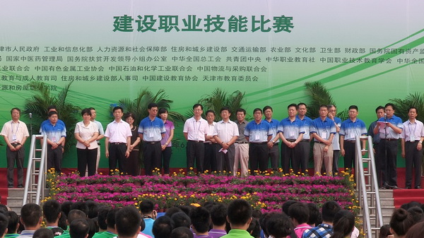 由教育部、天津市人民政府、工业和信息化部、人力资源和社会保障部、住房和城乡建设部、交通运输部、农业部、文化部、卫生部、财政部、国务院国有资产监督管理委员会、国家旅游局、国务院扶贫开发领导小组办公室、中华全国总工会、共青团中央、中华职业教育社、中国职业技术教育学会、中华全国供销合作总社、中国机械工业联合会、中国有色金属工业协会、中国石油和化学工业联合会、中国物流与采购联合会主办,由教育部职业教育与成人教育司、住房和城乡建设部人事司、中国建设教育协会、天津市教育委员会承办,天津国土资源和房屋职业学院协办的2012年全国职业院校技能大赛中职组建设职业技能比赛于6月25日上午9时在天津国土资源和房屋职业学院隆重开幕。住房和城乡建设部人事司司长王宁、住房和城乡建设部人事司副巡视员陈付、教育部职成司学校管理处处长葛维威、中国建设教育协会理事长李竹成、住房和城乡建设部人事司副主任科员胡秀梅、天津市城乡建设和交通委员会副主任王旭东、天津市城乡建设和交通委员会人事教育处于金生、天津滨海新区大港管委会副主任左凤伟、天津滨海新区大港管委会办公室副主任刘云章、天津市教育委员会老干部处处长张治敬、天津市国土资源和房屋管理局副局长路红、天津市国土资源和房屋管理局科技教育处处长杜艳霞、天津市国土资源和房屋管理局科级教育处副处长李庆义、中国建设教育协会副秘书长徐家华、中国建设教育协会副主任胡晓光、天津国土资源和房屋职业学院党委书记黄克敬、天津国土资源和房屋职业学院院长王钊等领导出席开幕式。来自全国各省、自治区、直辖市、计划单列市和新疆生产建设兵团的36支代表队的领队、指导教师和488名参赛选手,新闻媒体记者,学院部分师生代表参加了大赛开赛式。