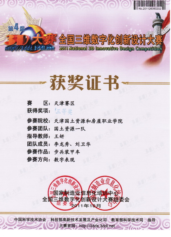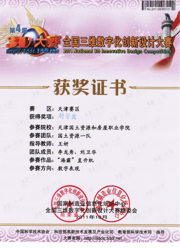 日前,我院建筑设备工程系学生参加了科技部国家制造业信息化培训中心组织的2011年全国三维数字化创新设计大赛。在王妍老师指导下,2009级计算机应用技术专业的李龙秀、刘卫华2名同学的参赛作品“海霸直升机”与“步兵装甲车”分获天津赛区特等奖和三等奖。 (建筑设备工程系)