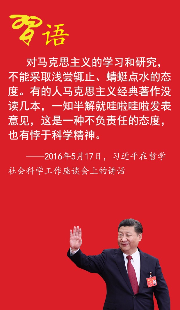 马克思主义经典作家眼界广阔、知识丰富,马克思主义理论体系和知识体系博大精深,涉及自然界、人类社会、人类思维各个领域,涉及历史、经济、政治、文化、社会、生态、科技、军事、党建等各个方面,不下大气力、不下苦功夫是难以掌握真谛、融会贯通的。“为学之道,必本于思。”“不深思则不能造于道,不深思而得者,其得易失。”我看过一些西方研究马克思主义的书,其结论未必正确,但在研究和考据马克思主义文本上,功课做得还是可以的。相比之下,我们一些研究在这方面的努力就远远不够了。恩格斯曾经说过:“即使只是在一个单独的历史事例上发展唯物主义的观点,也是一项要求多年冷静钻研的科学工作,因为很明显,在这里只说空话是无济于事的,只有靠大量的、批判地审查过的、充分地掌握了的历史资料,才能解决这样的任务。”对马克思主义的学习和研究,不能采取浅尝辄止、蜻蜓点水的态度。有的人马克思主义经典著作没读几本,一知半解就哇啦哇啦发表意见,这是一种不负责任的态度,也有悖于科学精神。 ——2016年5月17日,习近平总书记在哲学社会科学工作座谈会上的讲话