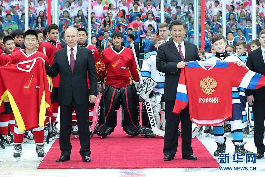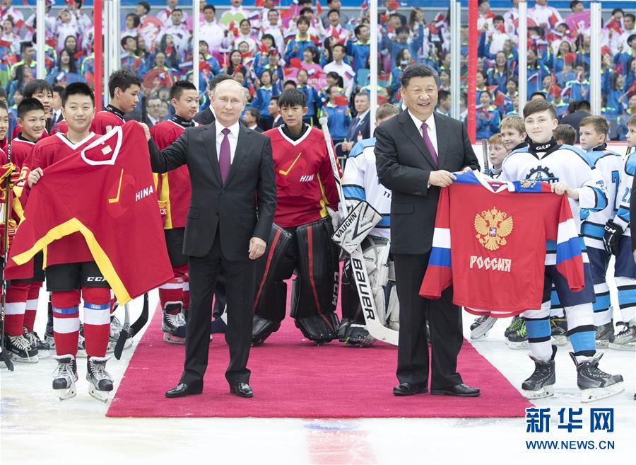 国家主席习近平8日晚同俄罗斯总统普京在天津共同观看中俄青少年冰球友谊赛。