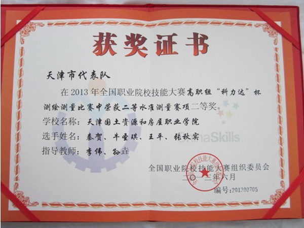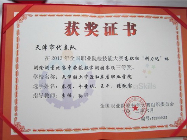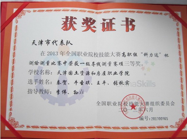 2013年6月7日至10日,“2013年全国职业院校技能大赛”在河南工业职业技术学院成功举办,共有来自全国61所高校的近300名队员参赛。由我院建筑工程系工程测量专业学生秦贺、牛圣琪、王平、张秋实组成的天津市代表队在此次全国高职组测绘测量赛项中荣获佳绩。