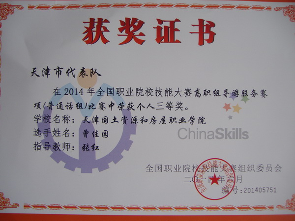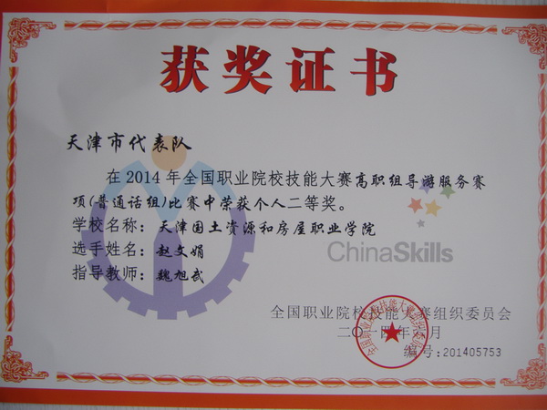 6月17日至19日, 2014全国职业院校技能大赛高职组导游服务赛项在浙江旅游职业学院举行。本次大赛由教育部、国家旅游局、浙江省人民政府主办,浙江省教育厅、浙江省旅游局承办,浙江旅游职业学院、全国旅游职业教育教学指导委员会等单位协办。大赛于6月17日开幕,为期3天,共有来自全国90所院校的143名选手参加中、英文两个组别的赛事比拼,并在导游词讲解、即兴演讲、旅游基础知识、综合理论笔试考核和才艺展示几个环节进行角逐。我院国贸系教师魏旭武、张红、刘珈伊带领2012级旅游管理专业学生赵文娟、曾佳园代表天津市代表队参加比赛,经过各环节激烈的竞争,最终赵文娟同学荣获中文组个人二等奖、曾佳园同学荣获中文组个人三等奖。(撰稿人:国贸系魏旭武)编辑:孙婧 审核:李贵森