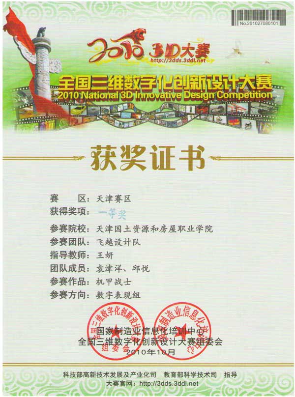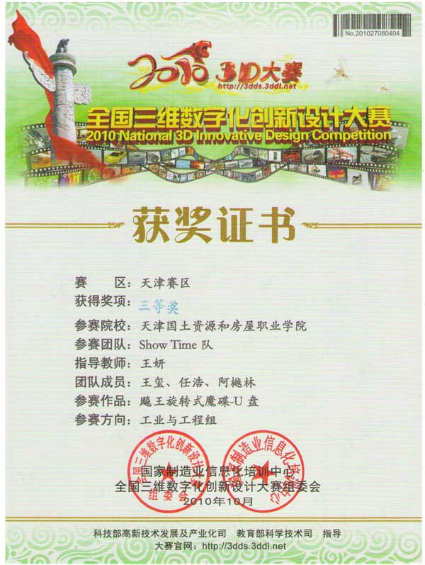 日前,我院计算机系学生参加了科技部国家制造业信息化培训中心3D办组织的2010年全国三维数字化创新设计大赛。在王妍老师指导下,08级计算机应用技术专业袁津洋、邱悦同学设计的参赛作品“机甲战士”获天津赛区一等奖;王玺、任浩、阿樾林同学设计的参赛作品“飚王旋转式魔碟-U盘”获天津赛区三等奖。此次比赛,展示了我院计算机系学生的创新设计能力,为学院争得了荣誉,也为以后工作奠定了基础。 (计算机系)