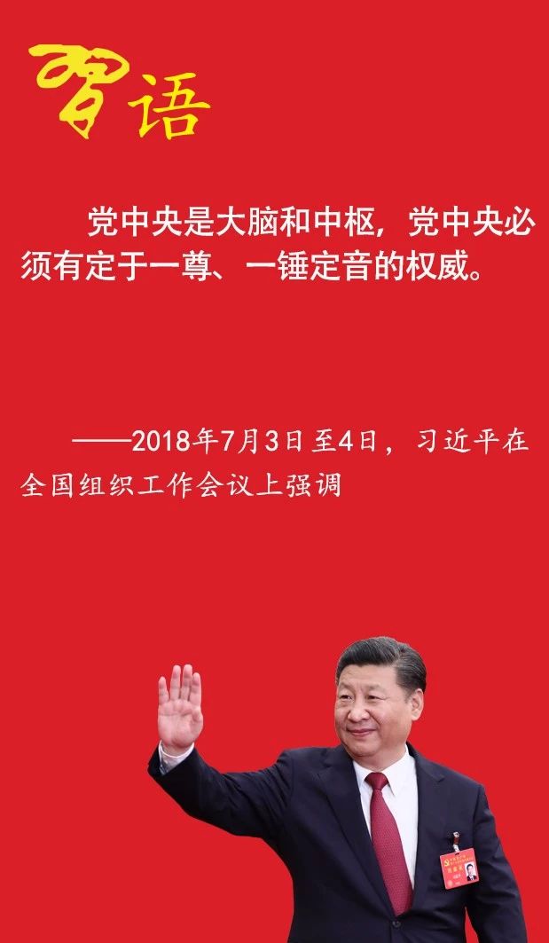 党的全面领导、党的全部工作要靠党的坚强组织体系去实现 党的全面领导、党的全部工作要靠党的坚强组织体系去实现。党中央是大脑和中枢,党中央必须有定于一尊、一锤定音的权威。党的地方组织的根本任务是确保党中央决策部署贯彻落实,有令即行、有禁即止。党组在党的组织体系中具有特殊地位,要贯彻落实党中央和上级党组织决策部署。每个党员特别是领导干部都要强化党的意识和组织观念,自觉做到思想上认同组织、政治上依靠组织、工作上服从组织、感情上信赖组织。 ——2018年7月3日至4日,习近平在全国组织工作会议上强调