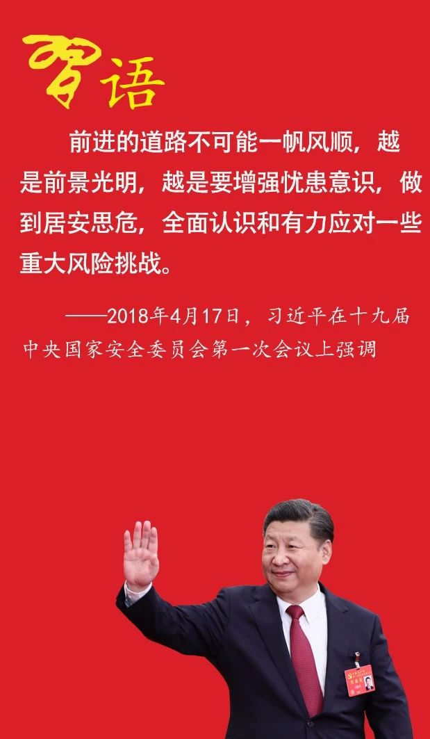 前进的道路不可能一帆风顺,越是前景光明,越是要增强忧患意识,做到居安思危,全面认识和有力应对一些重大风险挑战。要聚焦重点,抓纲带目,着力防范各类风险挑战内外联动、累积叠加,不断提高国家安全能力。 ——2018年4月17日,习近平在十九届中央国家安全委员会第一次会议上强调