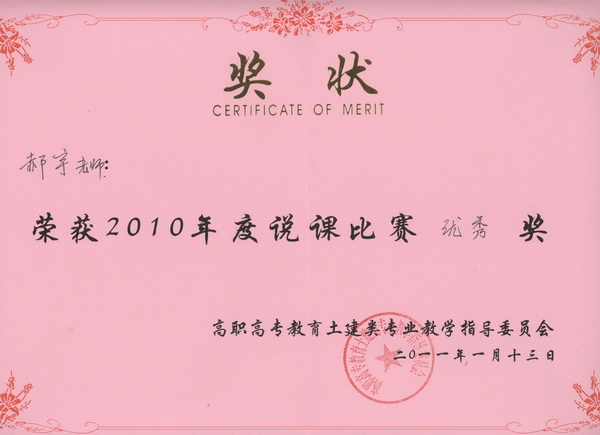 2011年1月13日,第二届高职高专教育土建类专业教学指导委员会城镇规划与园林类分指导委员会第二次工作会议暨2010年度毕业设计竞赛、说课比赛、说专业比赛在上海举行。我院艺术设计系井云、郝宇两位老师参加了这次会议,并选派郝宇参加了城镇规划与园林类专业2010年度“说课比赛”,获得园林类优秀奖。 (艺术系)