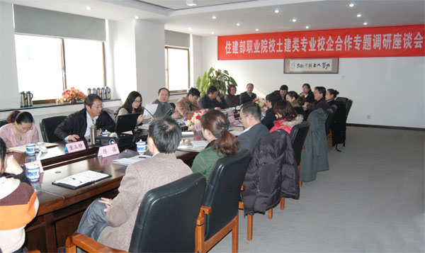 我院院长王钊主持座谈会,对出席会议的各级领导、各位专家和老师们表示热烈欢迎,并结合我院“校企合作”的体制机制建设、人才培养模式、教学资源共享及对“校企合作”发展建议等方面进行汇报。住建部人事司调研员高延伟在讲话中分析了全国职业学院“校企合作,工学结合”的发展情况,并结合全国土建类专业“校企合作”存在问题与矛盾,明确住建部此次调研的目的、意义。天津城市建设管理职业技术学院副院长樊全来就该校“校企合作”情况进行了汇报。