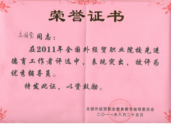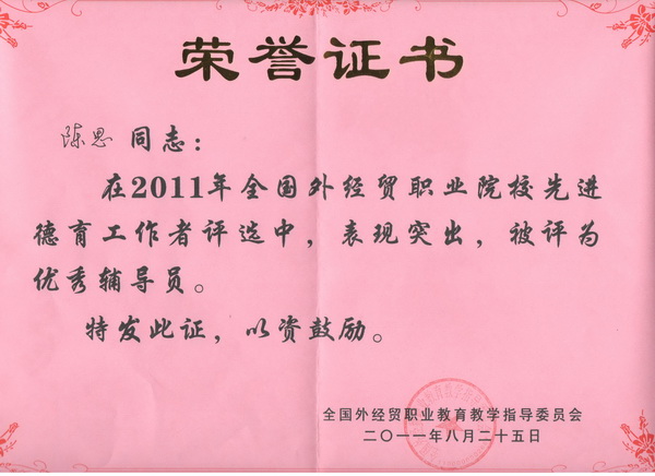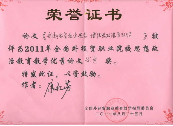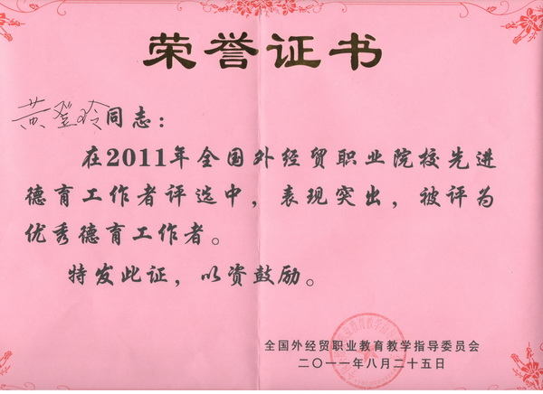 由全国外经贸行指委德育工作委员会牵头的全国外经贸职业院校德育工作表彰暨理论研讨会在海南召开。根据全国外经贸职业教育教学指导委员会《关于评选全国外经贸职业院校德育工作先进个人的通知》精神,经各会员单位校推荐,全国外经贸职业教育教学指导委员会审查,我院国际经济贸易系黄登玲荣获全国外经贸职业院校优秀德育工作者荣誉称号,左国莹、陈思获优秀辅导员荣誉称号,思政部康礼芳的论文《创新教育教学观念 增强思政课实效性》荣获优秀奖。